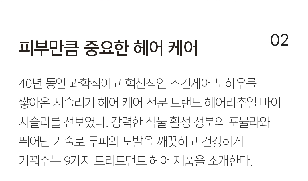 02 피부만큼 중요한 헤어 케어 40년 동안 과학적이고 혁신적인 스킨케어 노하우를 쌓아온 시슬리가 헤어 케어 전문 브랜드 헤어리추얼 바이 시슬리를 선보였다. 강력한 식물 활성 성분의 포뮬라와 뛰어난 기술로 두피와 모발을 깨끗하고 건강하게 가꿔주는 9가지 트리트먼트 헤어 제품을 소개한다. 머릿결을 살리는 올바른 습관