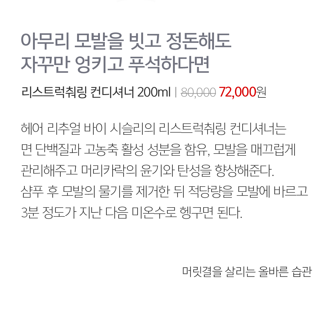 07 아무리 모발을 빗고 정돈해도 자꾸만 엉키고 푸석하다면 리스트럭춰링 컨디셔너 200mlㅣ80,000 72,000원 헤어 리추얼 바이 시슬리의 리스트럭춰링 컨디셔너는 면 단백질과 고농축 활성 성분을 함유, 모발을 매끄럽게 관리해주고 머리카락의 윤기와 탄성을 향상해준다. 샴푸 후 모발의 물기를 제거한 뒤 적당량을 모발에 바르고 3분 정도가 지난 다음 미온수로 헹구면 된다.  머릿결을 살리는 올바른 습관