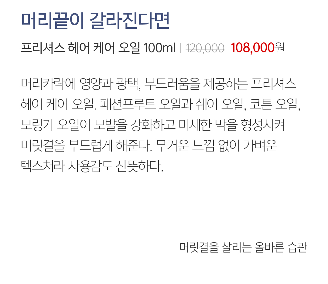 09 머리끝이 갈라진다면 프리셔스 헤어 케어 오일 100mlㅣ120,000  108,000원 머리카락에 영양과 광택, 부드러움을 제공하는 프리셔스  헤어 케어 오일. 패션프루트 오일과 쉐어 오일, 코튼 오일,  모링가 오일이 모발을 강화하고 미세한 막을 형성시켜 머릿결을 부드럽게 해준다. 무거운 느낌 없이 가벼운 텍스처라 사용감도 산뜻하다. 머릿결을 살리는 올바른 습관